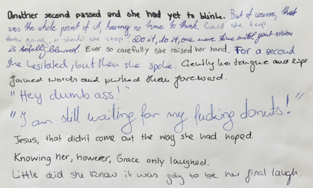 - ABC story – you can also do the abc story on your own, or do it as a poem instead. It's a great prompt to practice finishing. In a group, it often yields very funny results. Passing round a piece of paper, the first person writes a sentence starting with an A, the second one starting with a B, and so on, until you reach the letter Z. (In the example story, we only made it to letter L.)